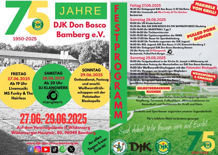 An diesem Wochenende steigt in Wildensorg eine große Jubiläumsfeier. Die DJK wird 75! Zudem feiern wir noch 55 Jahren Herren-Basketball und 50 Jahre Damen-Basketball bei der DJK!